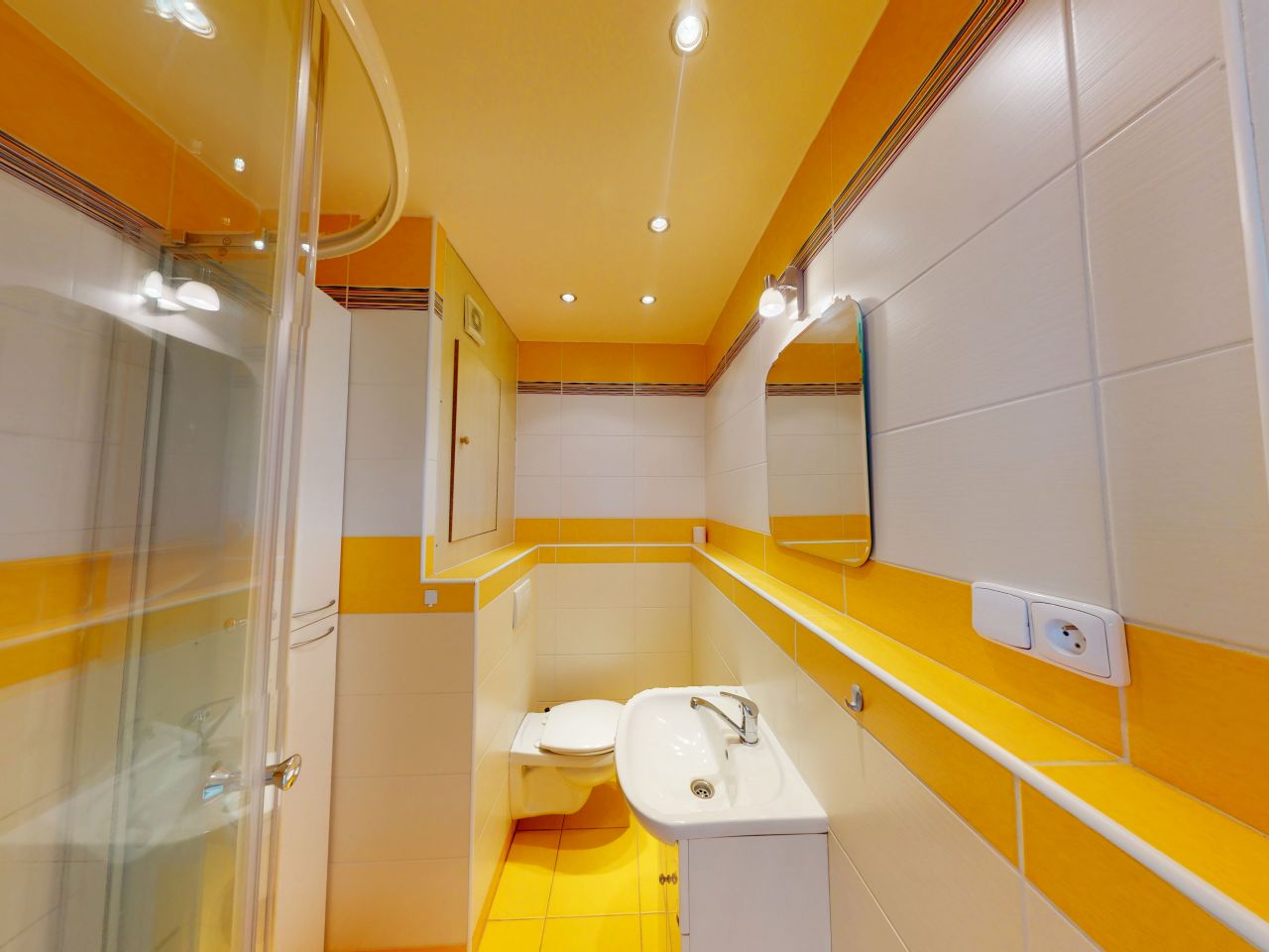 Koupelna je se sprchovým koutem, umyvadlovou skříňkou a toaletou (společně). Byt je částečně vybaven.