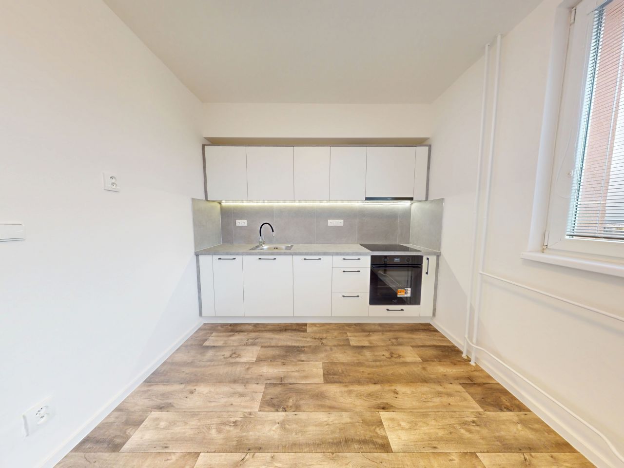 Kuchyně disponuje novou kuchyňskou linkou s vestavěnou troubou, digestoří a elektrickou varnou deskou.