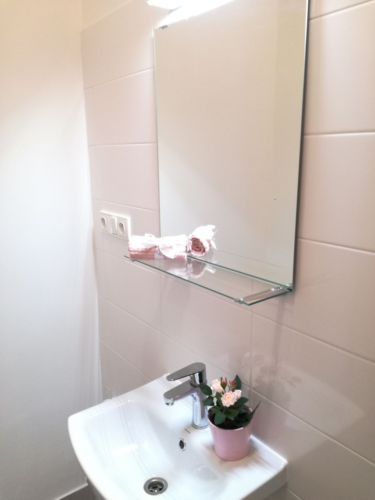 Byt má vyzděné jádro, podlahy, rozvody, omítky, interiérové dveře. Koupelna s vanou a umyvadlem s možností připojení pračky, toaleta je odděleně. Kuchyňská linka je opatřena elektrickým sporákem a elektrickou troubou a s možností připojení myčky.