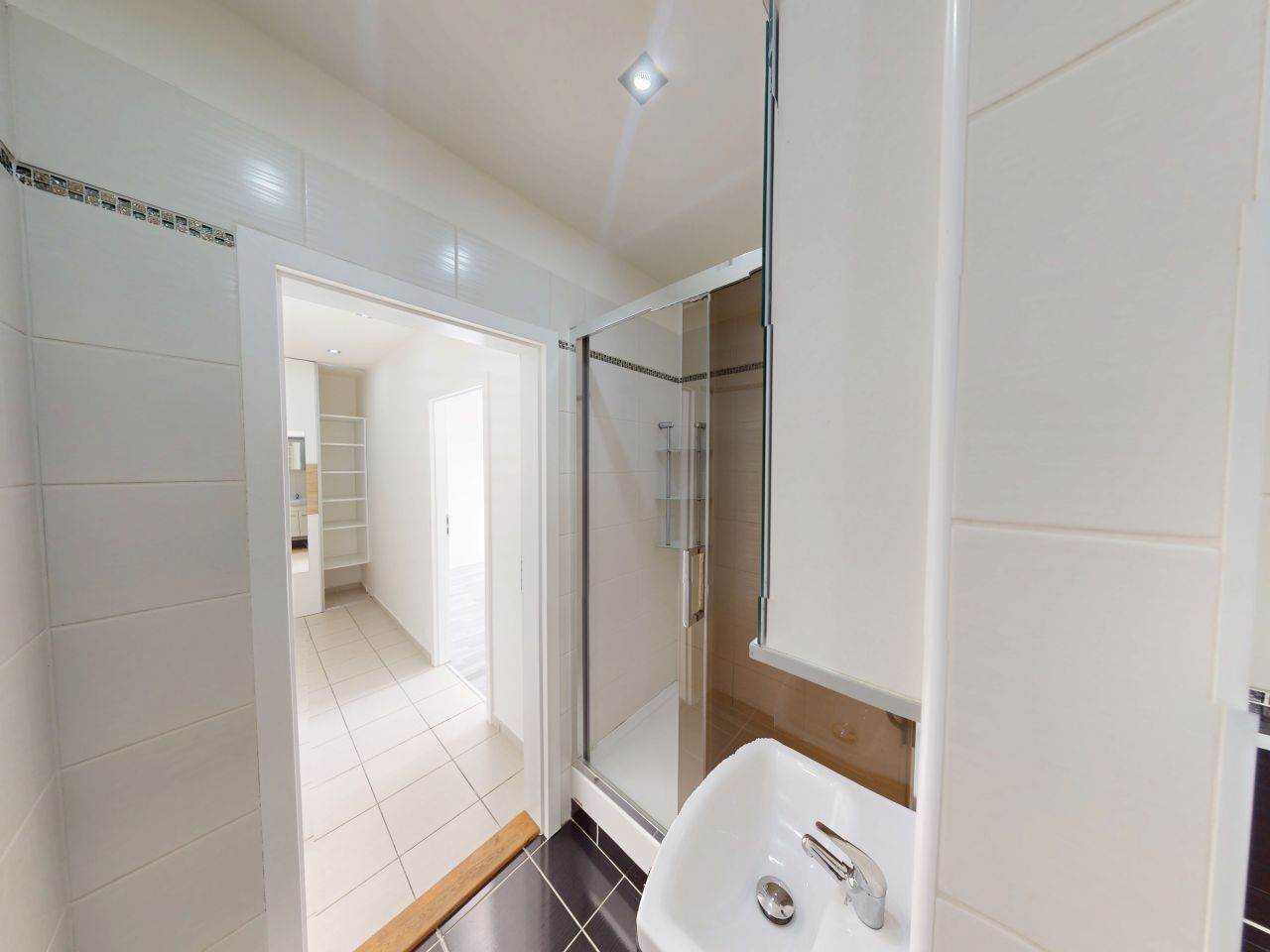 Koupelna se sprchovým koutem, umyvadlovou skříňkou a přepážkou oddělenou toaletou – praktické řešení pro větší soukromí.