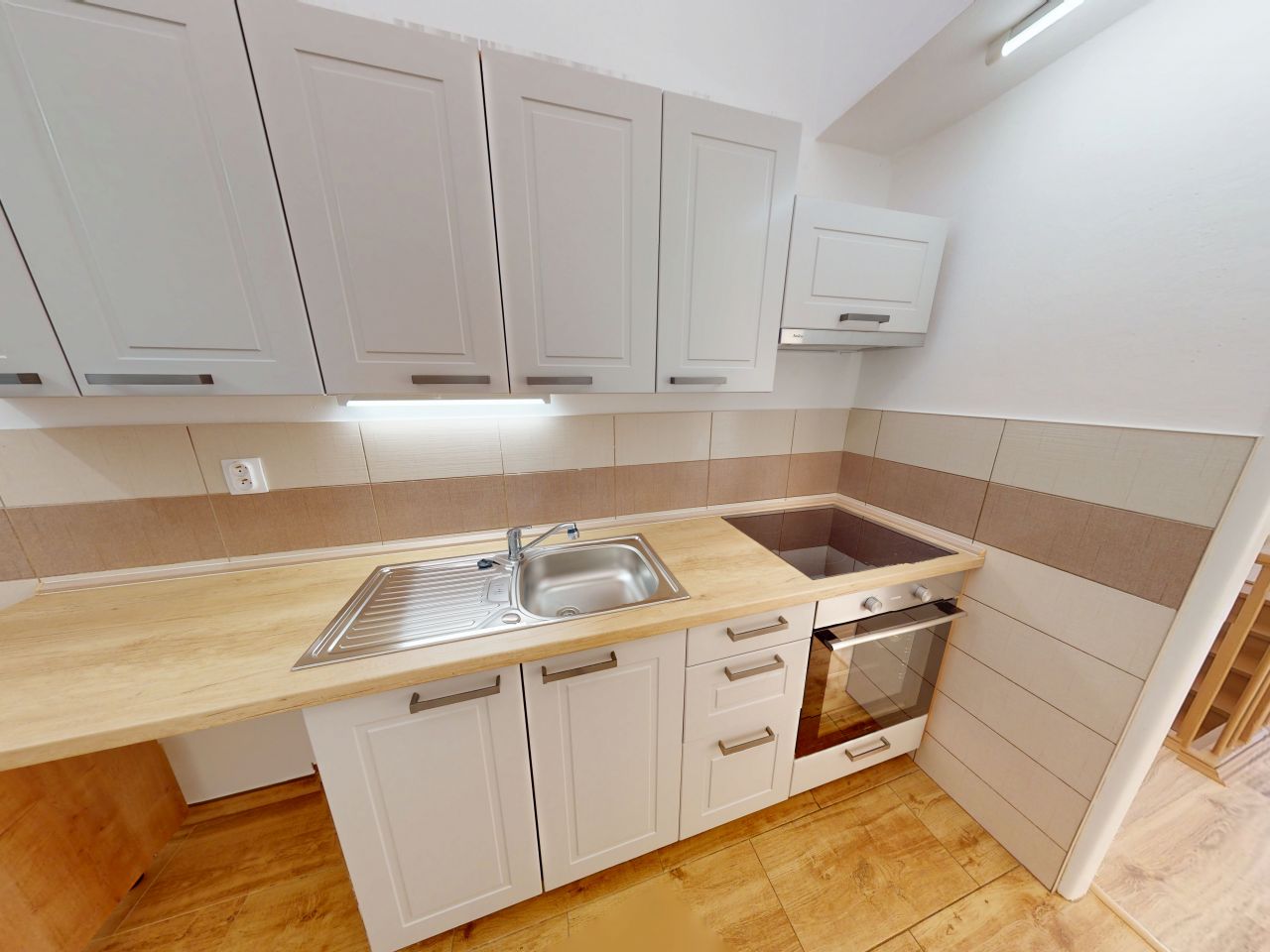 Byt je vybaven novými podlahami a kuchyňskou linkou s varnou deskou, elektrickou troubou a digestoří. Vedle linky je prostor pro lednici, v kuchyni lze umístit pračku či myčku dle podnájemce. Velkou výhodou jsou tři samostatné komory, které poskytují dostatek úložného prostoru.
